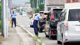 交差点では町交通指導隊が啓発物品を手渡し、スーパーマーケットでは町交通安全母の会のメンバーが買い物客らに交通安全を呼び掛けた。