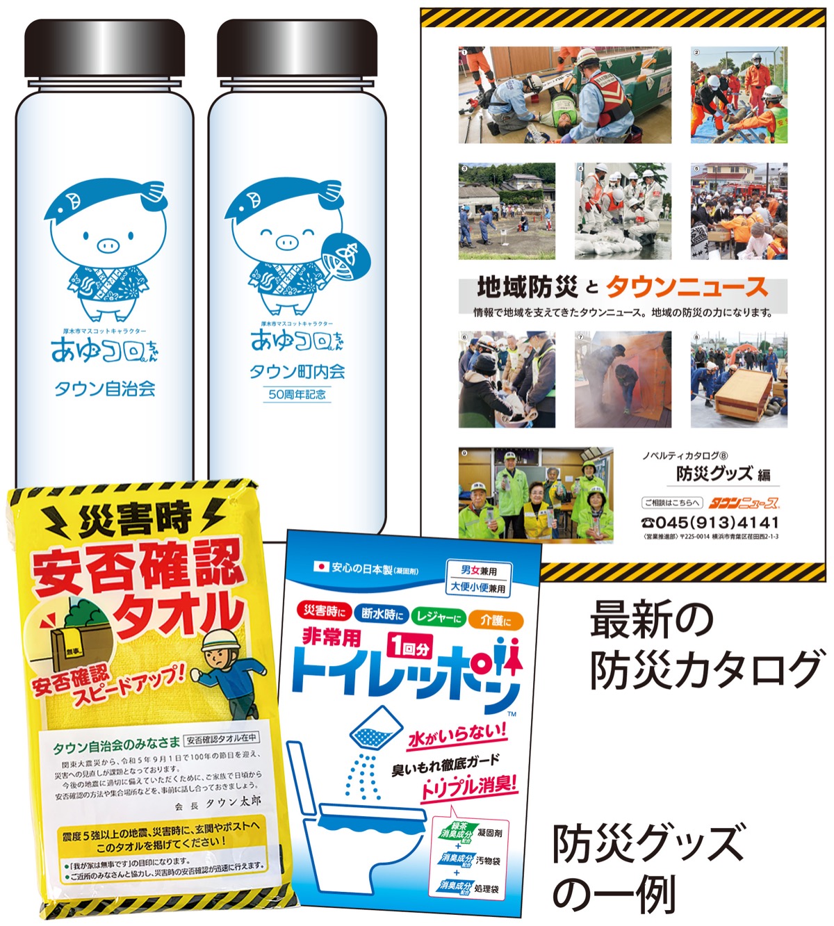 タウンニュース社では注目の防災グッズを満載したカタログを、希望する自治会等の代表者や防災担当者に進呈している。内容は防災ボトル、非常用簡易トイレやランタン、給水バッグ、安否確認タオルなど。