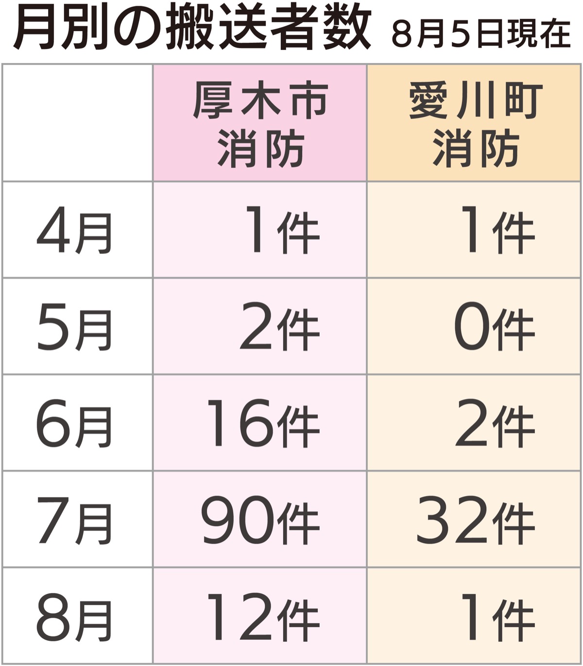 愛川町消防本部では、5日現在の搬送者が36件で前年同期比で4件増加。6月までは3件だったが、7月だけで32件に上り、統計開始以降最多を更新した。