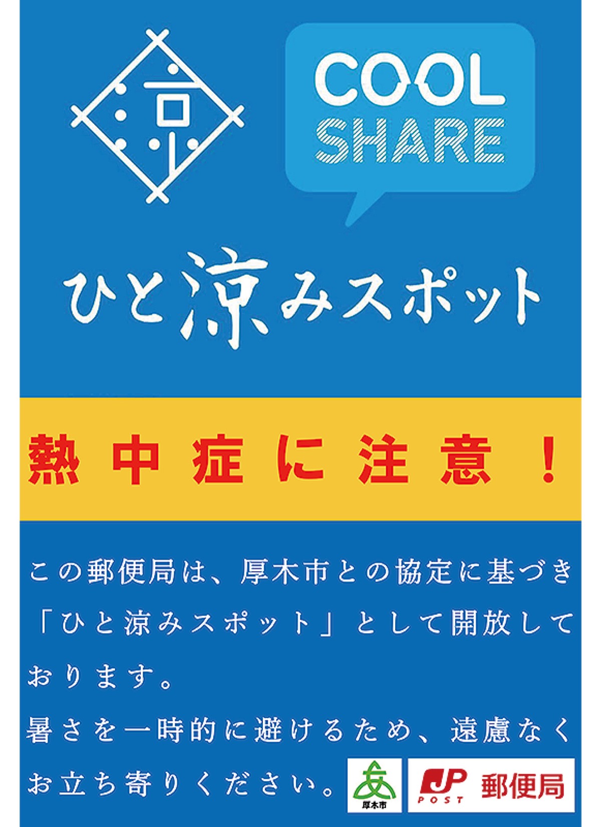 厚木市内の16郵便局が8月9日から新たに「ひと涼みスポット」として開放された。