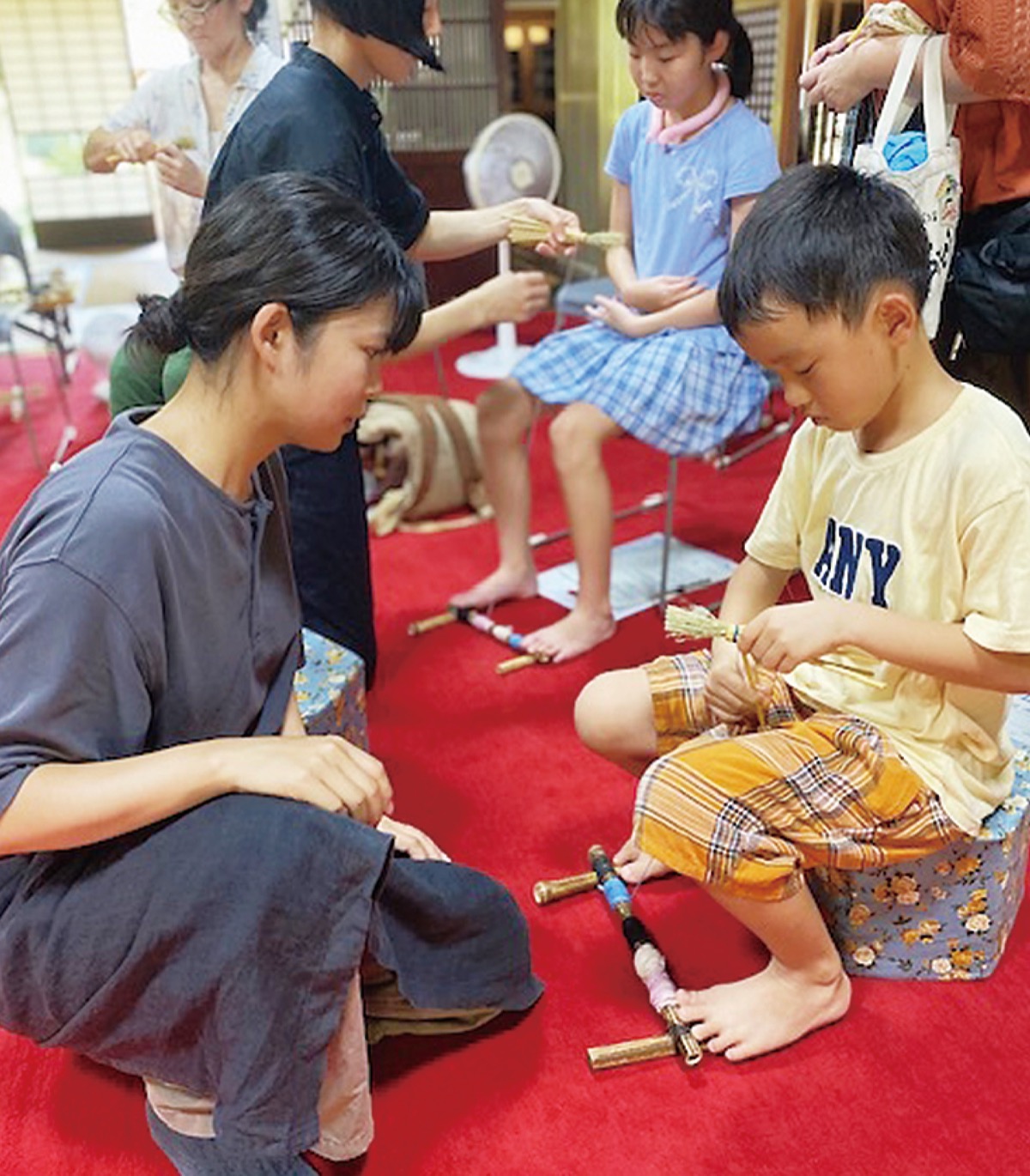 教室には、伝統的な箒文化の伝承に取り組む株式会社まちづくり山上が協力。埼玉県や都内など、町内外から参加した6歳から77歳までの27人は、町内で栽培されたホウキモロコシの穂や茎を使い、ミニサイズの箒作りに挑戦した。