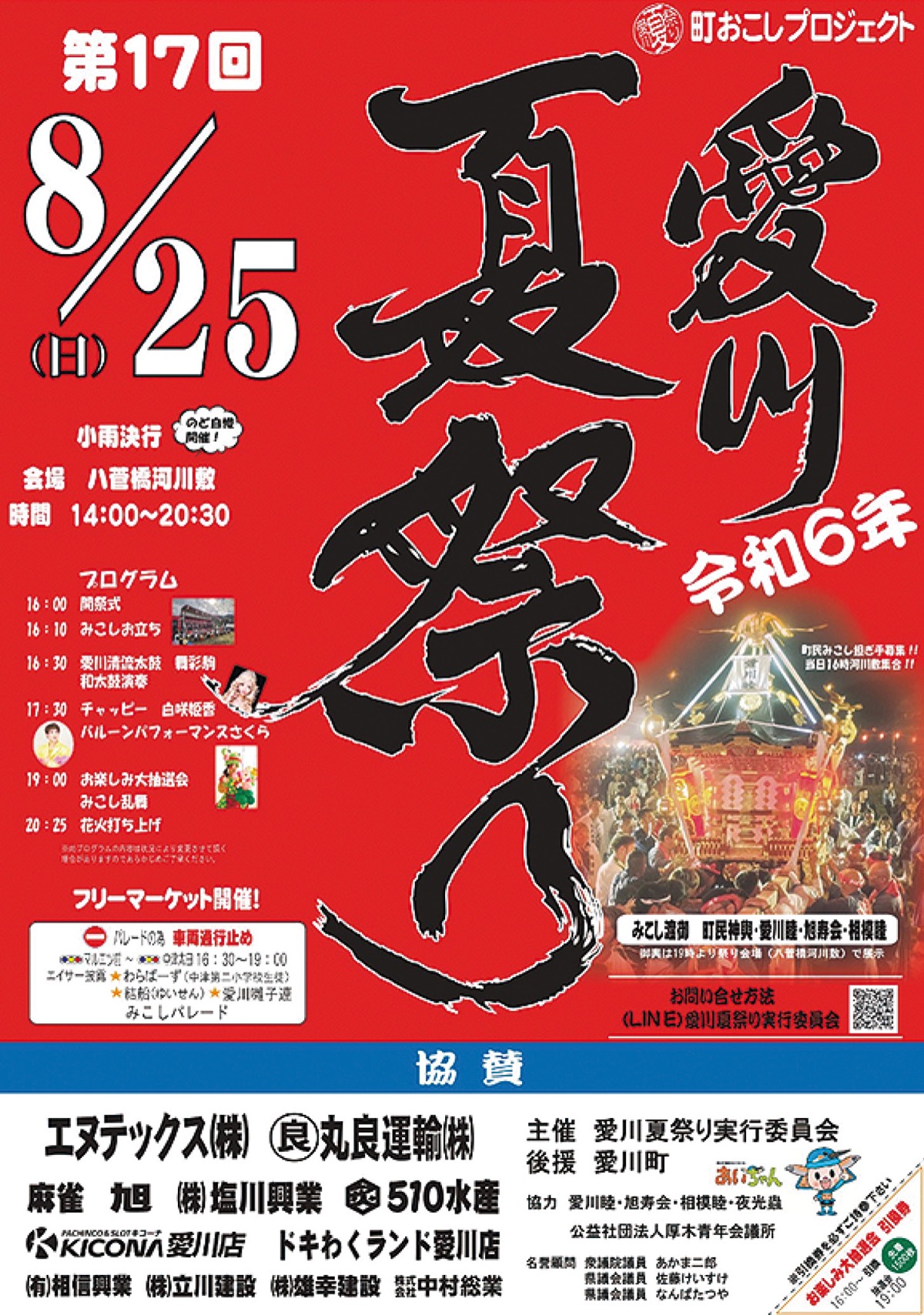 神輿の練り歩きや愛川清流太鼓と舞彩駒による和太鼓演奏(午後4時30分〜)、バルーンパフォーマーなどによるステージ(5時30分〜)のほか、抽選会(7時〜)やフリーマーケットも企画。8時25分からは花火の打ち上げもある。