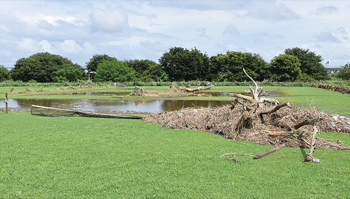 晴れ間がのぞいた31日、水が引いた酒井スポーツ広場には大きな水たまりが残り、テニスコートには巨大な流木などが堆積。市では復旧に向けた準備を進めており、管理事務所のスタッフは「土日は予約で埋まっていたが、当面は利用できないだろう」と話した。