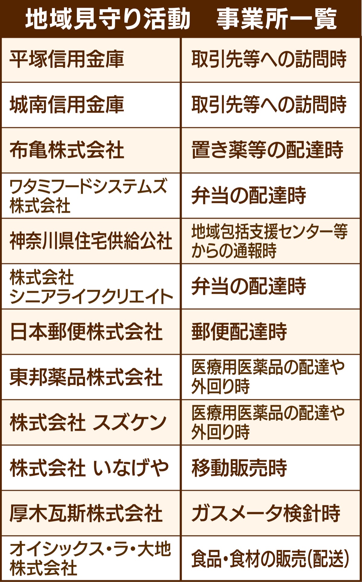 また神奈川県では(公社)神奈川県LPガス協会をはじめ神奈川県新聞販売組合、生活協同組合、信用金庫、(公社)神奈川県宅地建物取引業協会ほか65事業所と協定を締結している(9月3日現在)。
