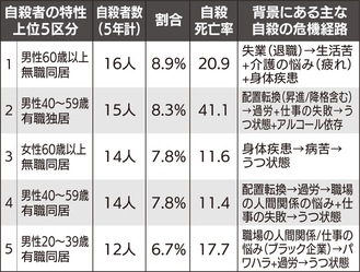特性別では、「男性60歳以上無職同居」が失業・退職後の生活苦や介護疲れ、身体疾患などを理由に命を絶つケースが多く、市内でも同5年間で16人(8・9%)の自殺者がこの特性に当てはまった。