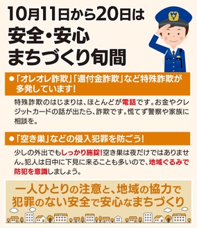 厚木警察署管内では、小田急線本厚木駅北口前で10月11日(金)午後2時から、啓発キャンペーン活動を予定している。