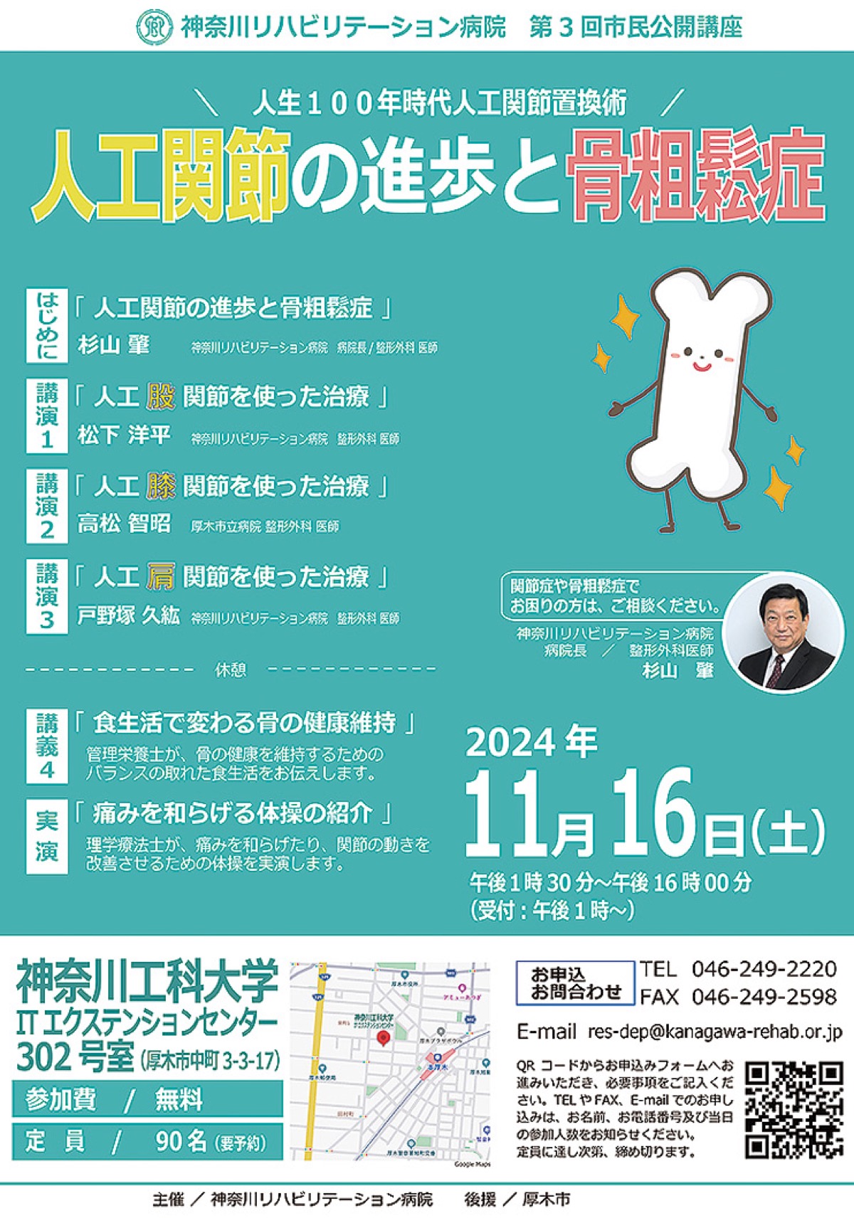 神奈川リハビリテーション病院が11月16日(土)、「人生100年時代人工関節置換術〜人工関節の進歩と骨粗鬆症〜」と題した市民公開講座を神奈川工科大学ITエクステンションセンター(厚木市中町3の3の17)で開く。午後1時30分から4時。