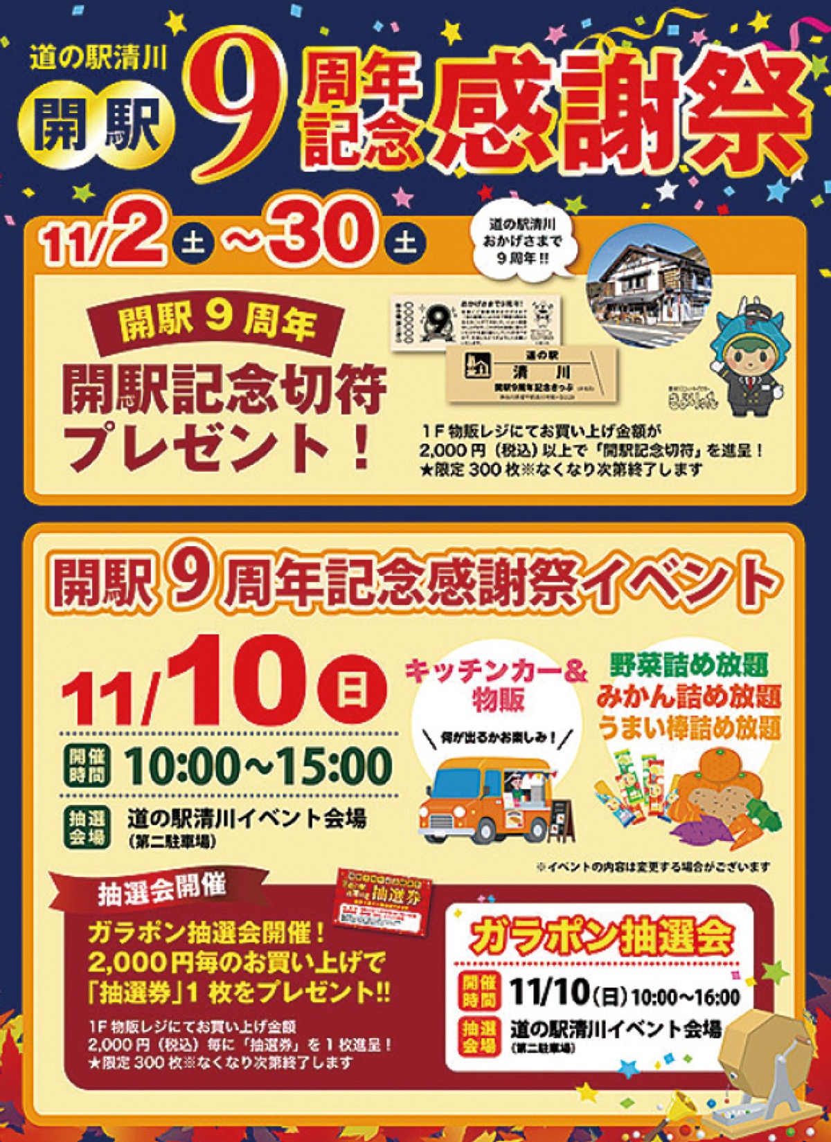 清川村の食が楽しめる「道の駅清川」が開駅9周年を迎える。感謝の気持ちを込めて11月2日(土)から30日(土)まで記念切符をプレゼント(2千円以上の買い物をされた方)。限定300枚、なくなり次第終了。10日(日)は野菜などの詰め放題、清川村特産品販売、キッチンカー、抽選会を実施。時間は10時〜15時。「ぜひ、おたのしみください!」とスタッフ。