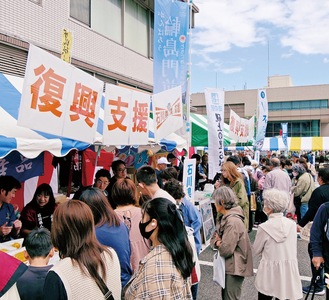 町の産業や文化を町内外に紹介する恒例イベント。「愛川ブランド認定品」や農産物、繊維製品、地酒といった地元特産品をはじめ、長野県産のリンゴやシャインマスカットなどが販売されたほか、復興応援企画として石川県能登半島や宮城県石巻市の特産品も並び、商品を買い求める来場者でにぎわった。