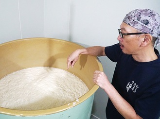 蔵の中には米袋が大量に積まれ、米を蒸す大きなかまどを職人2人が磨き上げるなど手入れに余念がない。蔵元の大矢俊介さん=写真=の案内で日本酒に欠かせない麹づくりの部屋に入ると、ふくよかな香りが漂う。