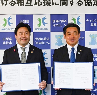 厚木市の山口貴裕市長は10月30日、山梨県北杜市を訪れ、大規模災害時に備えた相互応援協定を上村英司北杜市長と締結した。