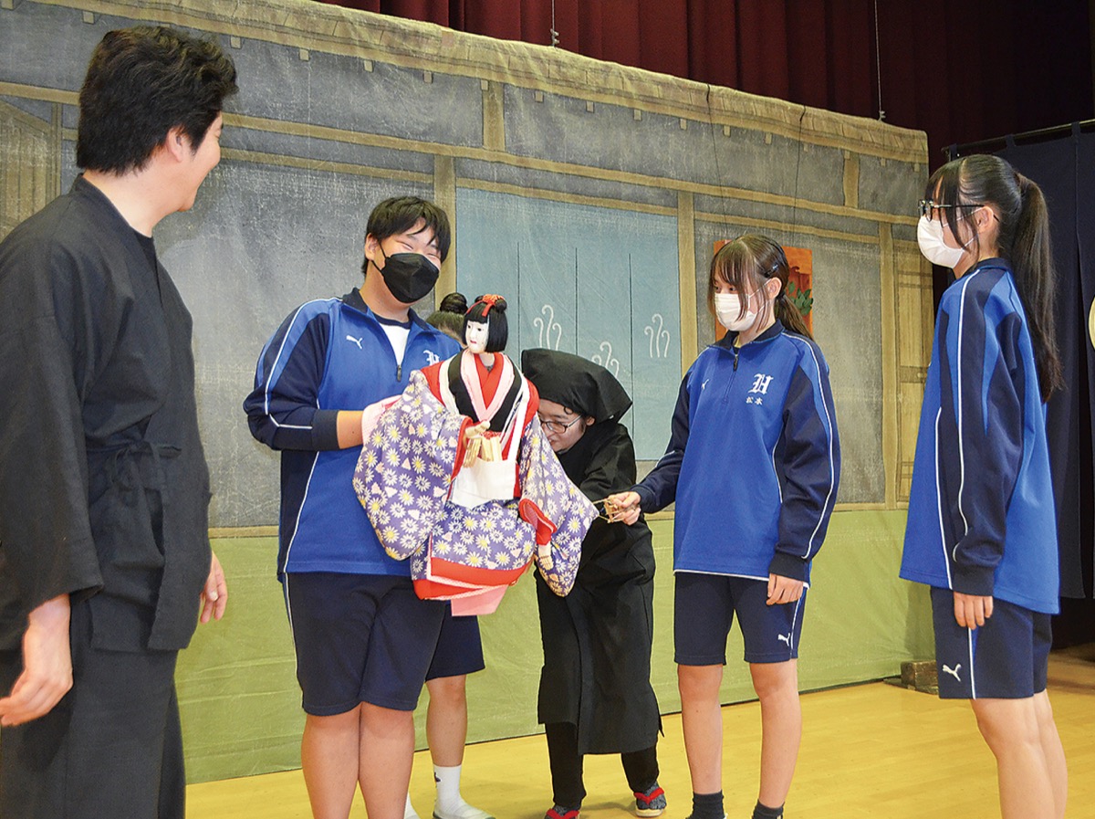 授業の最後には生徒が人形を持ち、指導を受けながら芝居を体験。熱心に動かし方を確認する生徒もいた。