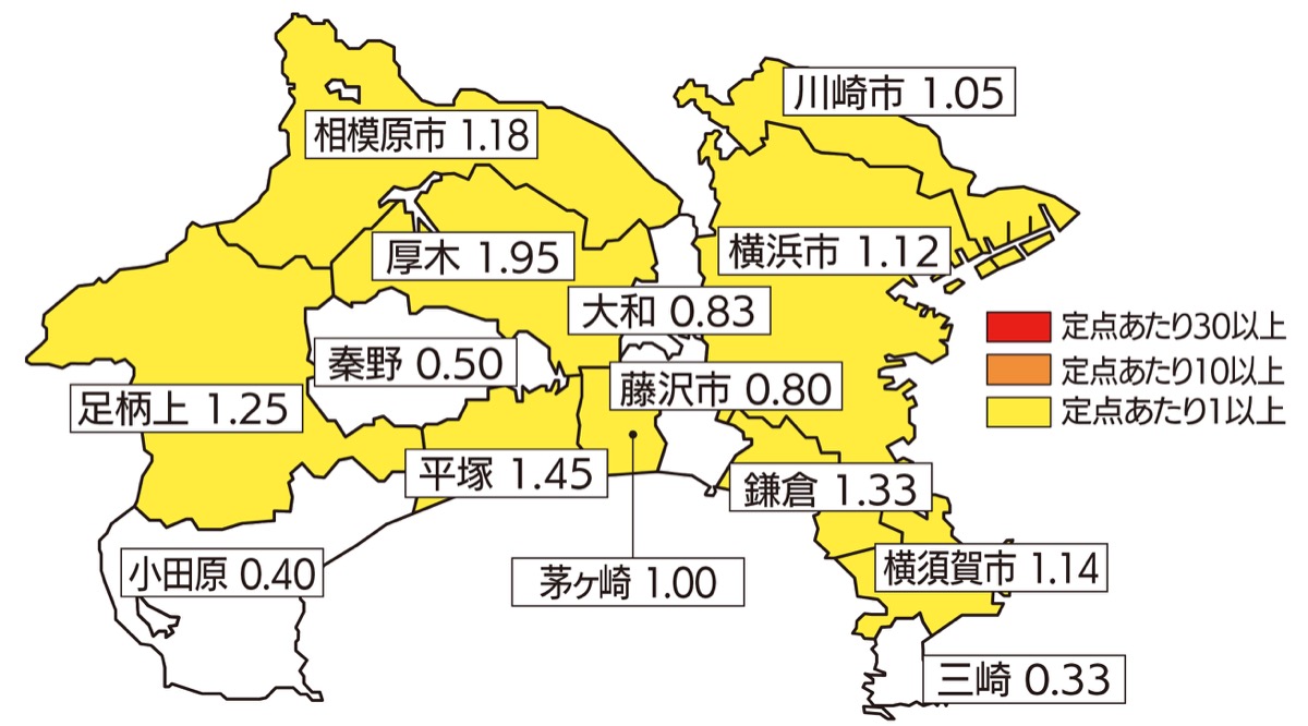 保健所単位の定点あたり報告数が流行開始基準の1・0を超えたのは、▽厚木(厚木市、海老名市、座間市、愛川町、清川村)▽平塚(平塚市、大磯町、二宮町)=1・45▽鎌倉(鎌倉市、逗子市、葉山町)=1・33▽足柄上(南足柄市、中井町、大井町、松田町、山北町、開成町)=1・25▽相模原市=1・18▽横須賀市=1・14▽横浜市=1・12▽川崎市=1・05▽茅ケ崎(茅ケ崎市、寒川町)=1・00だった。