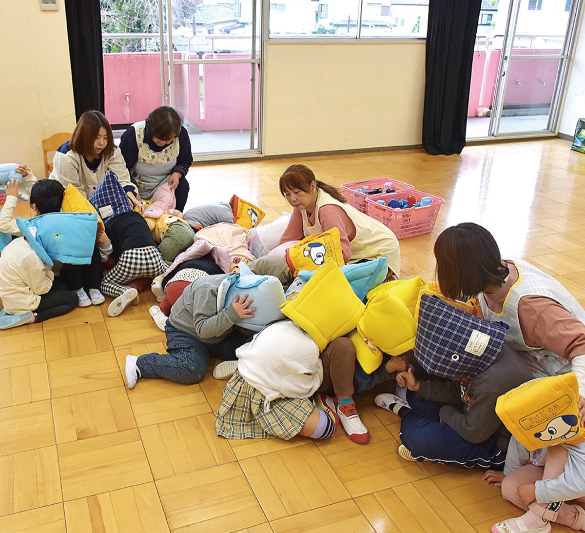 4・5歳児は、消防職員から火事が起きた際の約束事として「おかしも(おさない・かけない・しゃべらない・もどらない)」という合言葉を学び、啓発アニメを視聴。園内に火災を知らせるアラームが鳴り響くとすぐさま防災頭巾をかぶり、「怖い」「大丈夫」と身を寄せ合ってうずくまり、口元を押さえながら園職員の誘導で園庭に避難した。