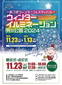 イルミネーションは厚木公園(ハトポッポ公園・中町3の7)に10mのクリスマスツリーが設置されるほか、県央地区で唯一の歩行者天国を持つ厚木一番街は、街路灯30基に青いロープライトを巻き幻想的な通りに。あつぎ公園通り商友会は厚木中央公園の正面入り口の木々に電飾を施し、光輝く夜の公園を演出する。