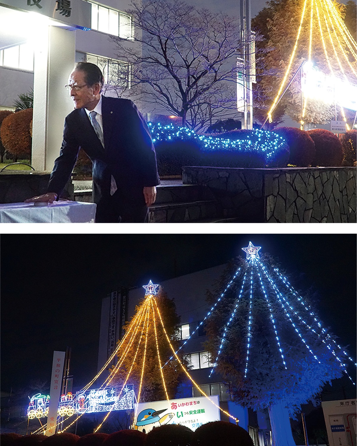 柏木会長は「寒い中ご参加を頂きありがとうございます。今年はサンタやベルをモチーフにした電飾を増やしました。明るい町づくりを応援していきます」と挨拶した。小野澤町長は「いよいよ愛川町も70周年を迎えます。この輝きに負けない明るく元気な愛川町にしていきたいと思っております」と応えた。