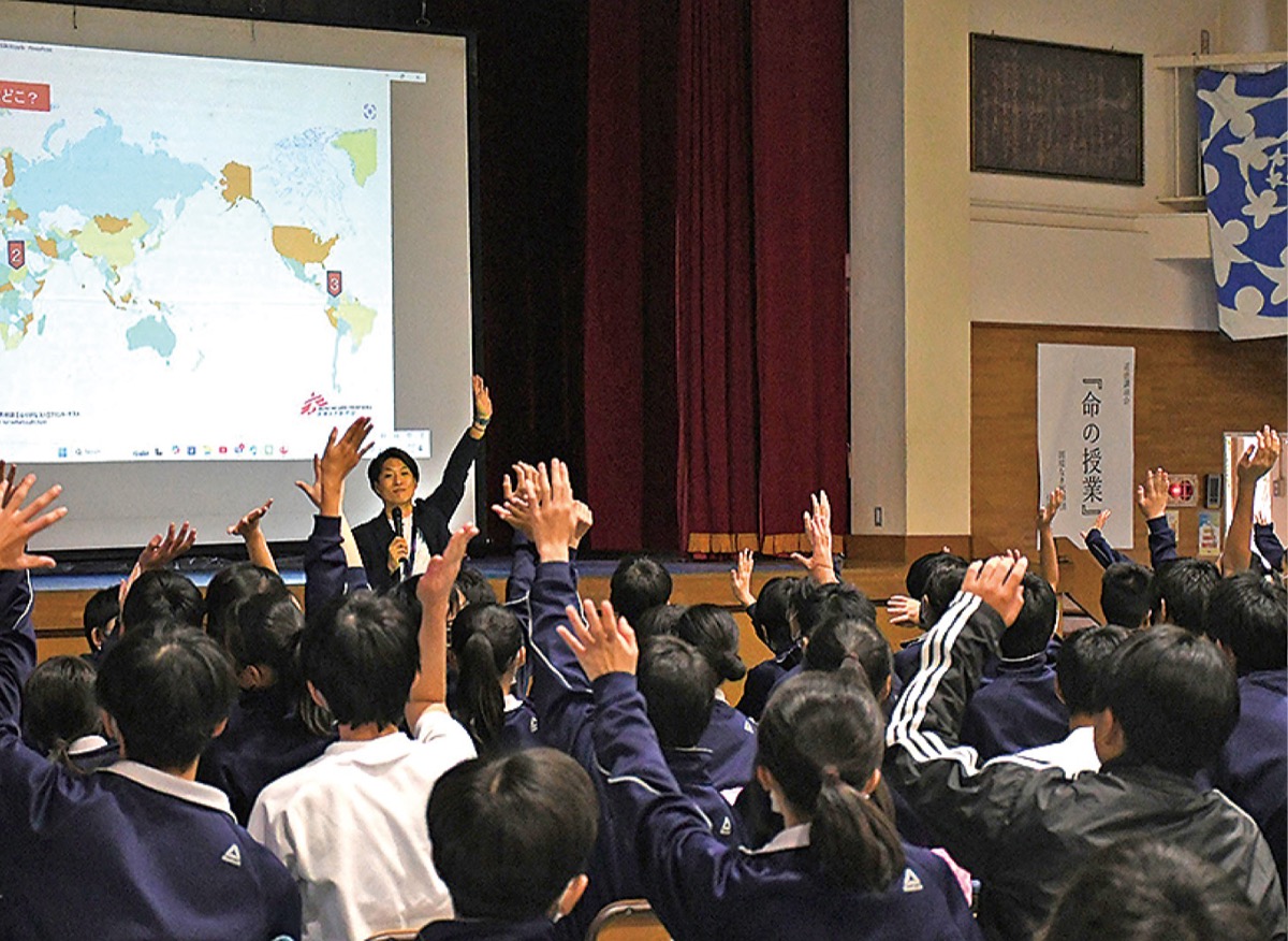 佐藤さんは、これまでにイラクやパレスチナなど7カ国に派遣。心臓が止まりそうな赤ちゃんに薬や酸素投与をしたくてもできなかった経験や、多数の患者がいる中で、大やけどを負った少年に最良の治療を施すために何ができるか葛藤したという経験談に、生徒らは真剣に耳を傾けていた。