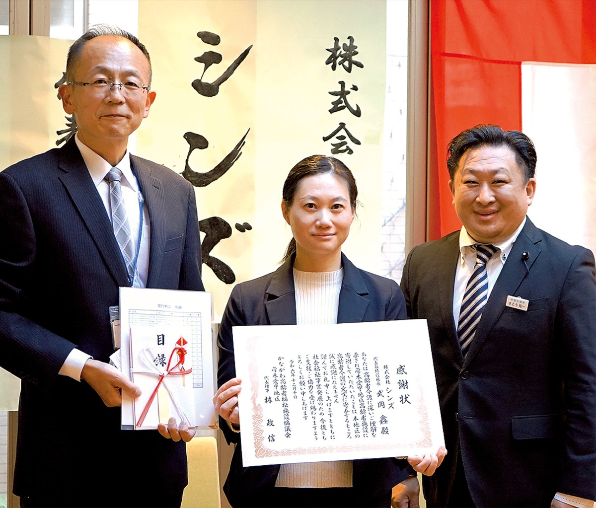 (株)シンズは厚木市栄町に本社を置き、国内外に製造工場を持つマスク製造メーカー。近年はマスクだけでなく紙おむつなどの製造も行っており、昨年12月にも県内施設にマスク3万枚・紙おむつ2千枚を寄付。またコロナ禍には神奈川県にマスク300万枚以上を寄贈するなど、社会貢献活動にも力を入れている。