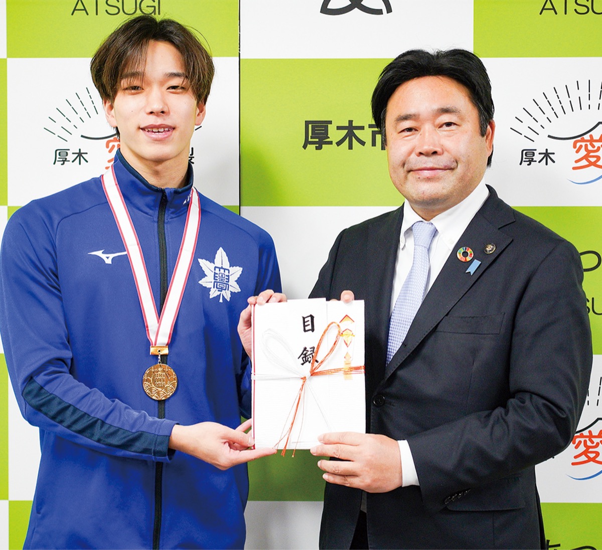 厚木市在住の森拓海さん(国士舘大学3年・コナミスポーツクラブ所属)が水泳の全国大会で入賞したことを受けて、12月17日に山口貴裕市長を表敬訪問した。