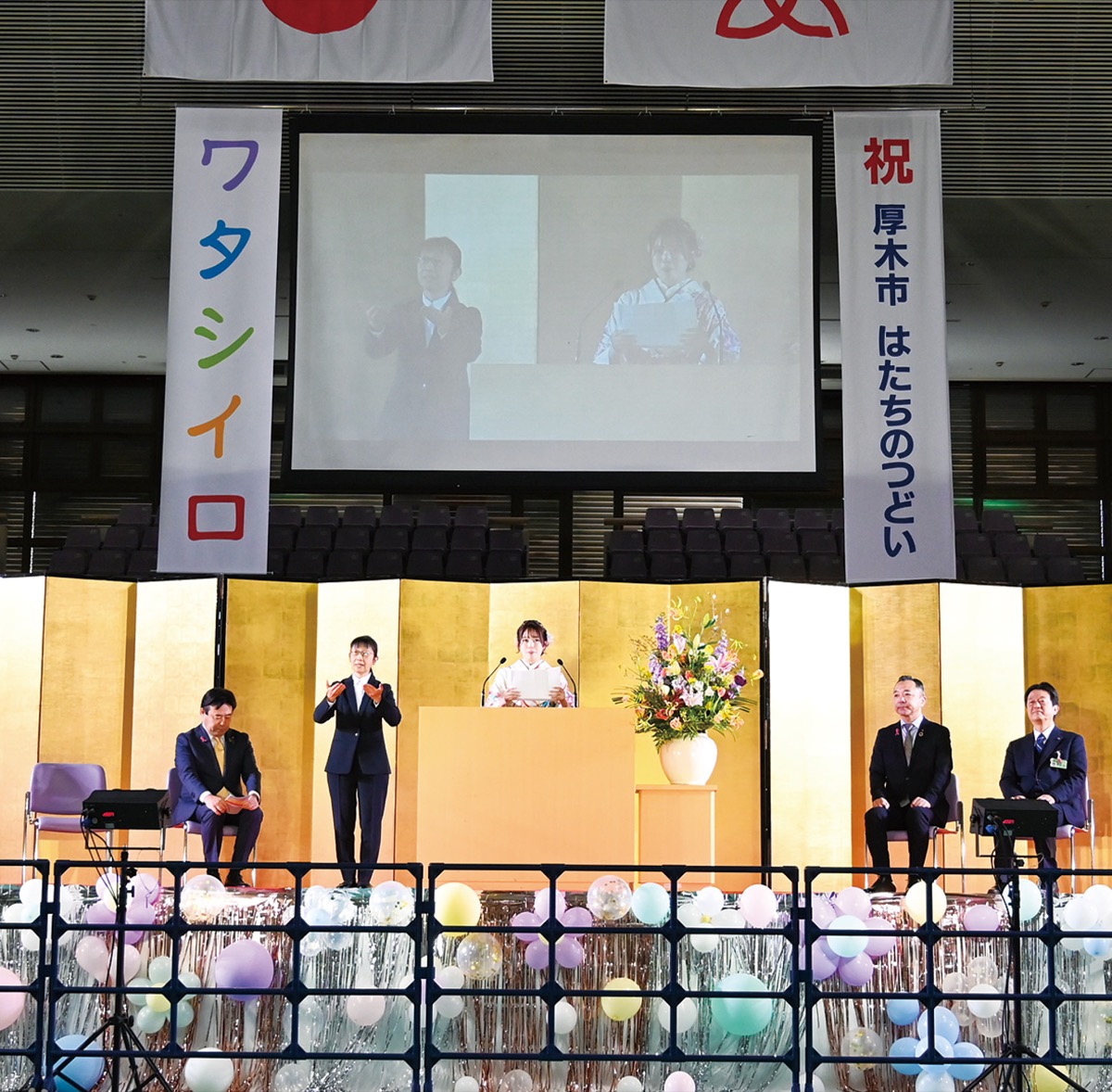 厚木市の対象者は2212人(前年比183人減)で、式典の「はたちのつどい」は1月13日(月・祝)に行われる。昨年は改修工事で利用できなかった厚木市文化会館の大ホールが会場となり、中学校区別に午前10時開場と午後2部開場の2部制で行われる。オープニングセレモニーでは「相模国飯山白龍太鼓」による演舞が会場を盛り上げ、実行委員長のあいさつと山口貴裕市長や来賓の祝辞が披露される。アトラクションとして中学時代の恩師からの祝いのビデオレターや抽選会がある。