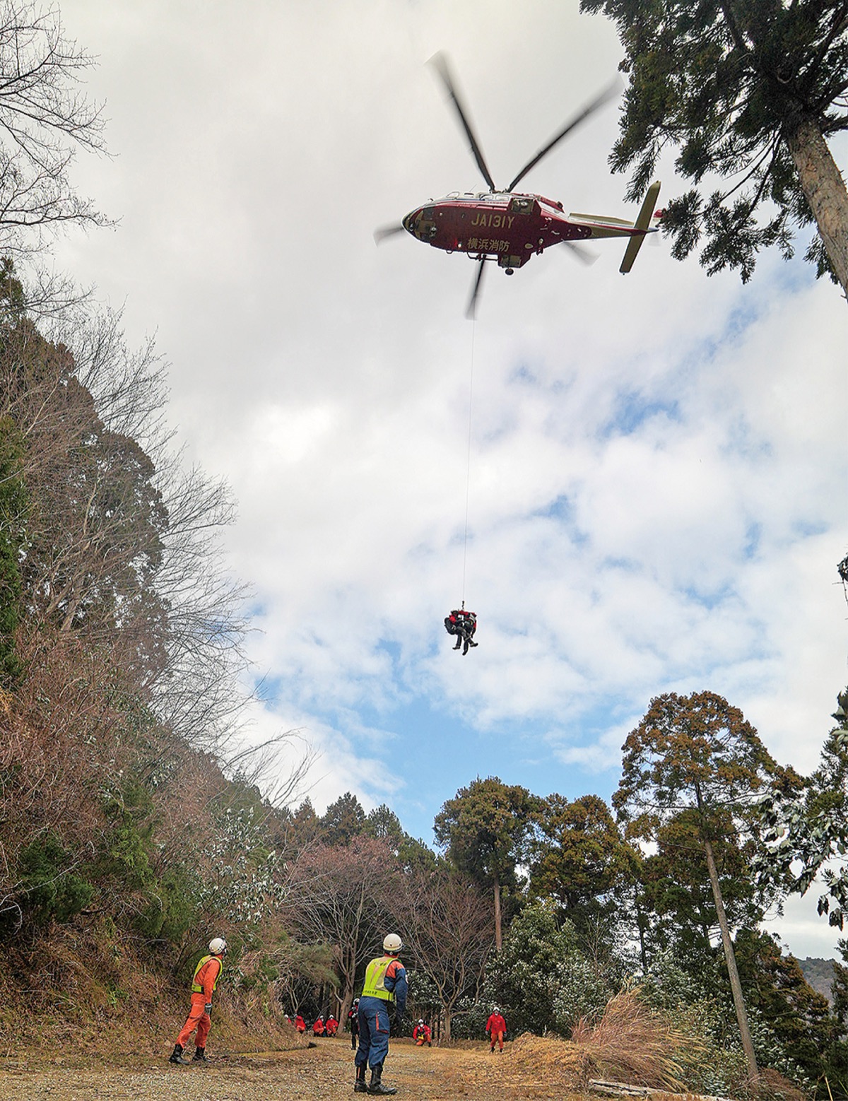 山間部での事故や災害発生時の迅速な救助活動に向け、厚木市消防本部と横浜市消防局航空隊が1月16日、連携強化に向けた合同訓練を七沢などで実施した。