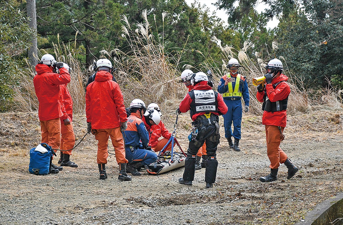 当日は救助隊ら28人が参加。丹沢山系での事故を想定し、要救助者を七沢のキャンプ場でヘリコプターに収容するため、航空隊員の降下やストレッチャーでの搬送方法など、航空隊との連携を確認した。要救助者を収容したヘリコプターは、救急隊が待機する温水のぼうさいの丘公園に移動。情報伝達の方法など、迅速な搬送に向けた手順について確認した。