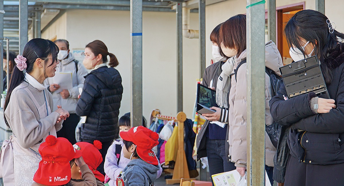 小学校に上がった子どもが新たな生活環境などに順応できない、いわゆる「小1プロブレム」の解決のため、国は幼・保・小の垣根を越えた取り組みを「架け橋プログラム」として推進している。この方針を受け、同園では2017年から関係者を招いた公開保育を実施しており、今回が3回目。