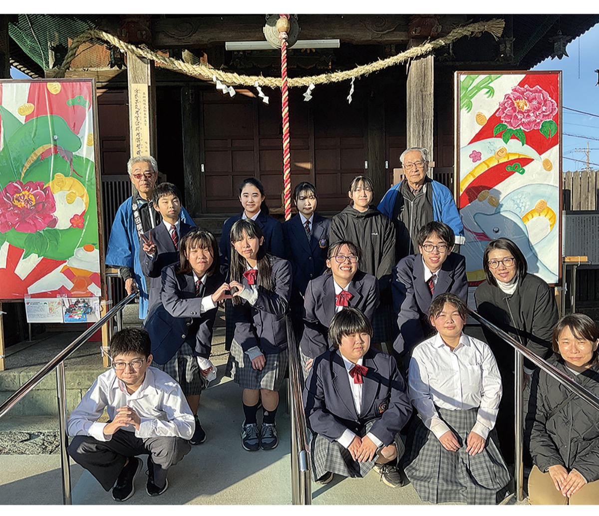 睦合東中学校の美術部が制作した干支の絵が地元の妻田薬師に奉納され、1月15日に生徒らが記念撮影に訪れた。