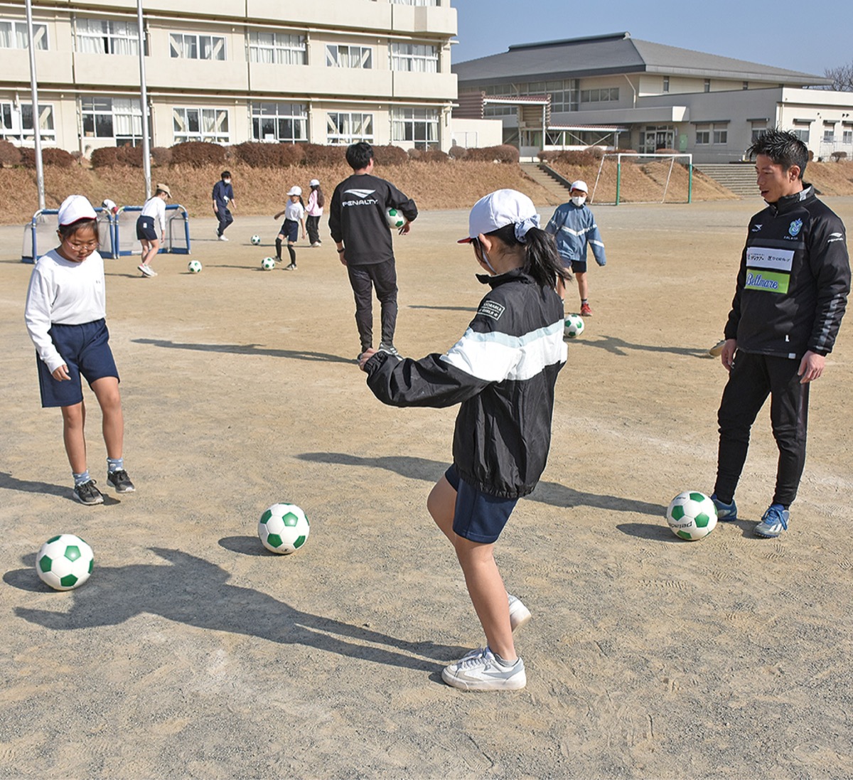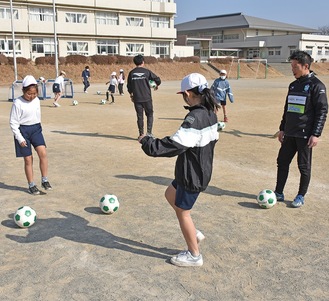 アカデミースタッフは「相手が取りやすいパスを出すためには、思いやりを持つことが大切」などと呼び掛けながら指導を行い、参加した児童は「ボールが跳ねないように、優しく転がしてパスを出そうと心掛けた」と話した。