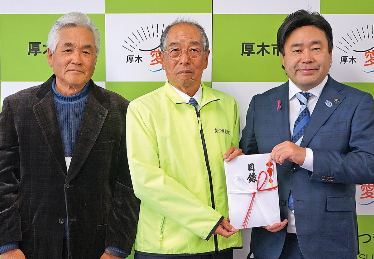 厚木市グラウンド・ゴルフ協会(立石良夫会長)は2月3日、厚木市のスポーツ振興を願って、会員らから積み立てられた寄付金7万円を山口市長に手渡した。