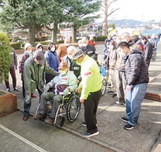 受講者は、スマートフォンで二次元コードを読み取りボランティア登録を行い、歩行困難者を福祉避難所まで搬送する想定で車椅子の操作や介助体験を行った。参加者は「災害ボランティアセンターの運営がICTの導入などで大きく変化していることに驚いた」「車椅子の取扱いや搬送方法を知ることができた」と感想を話した。