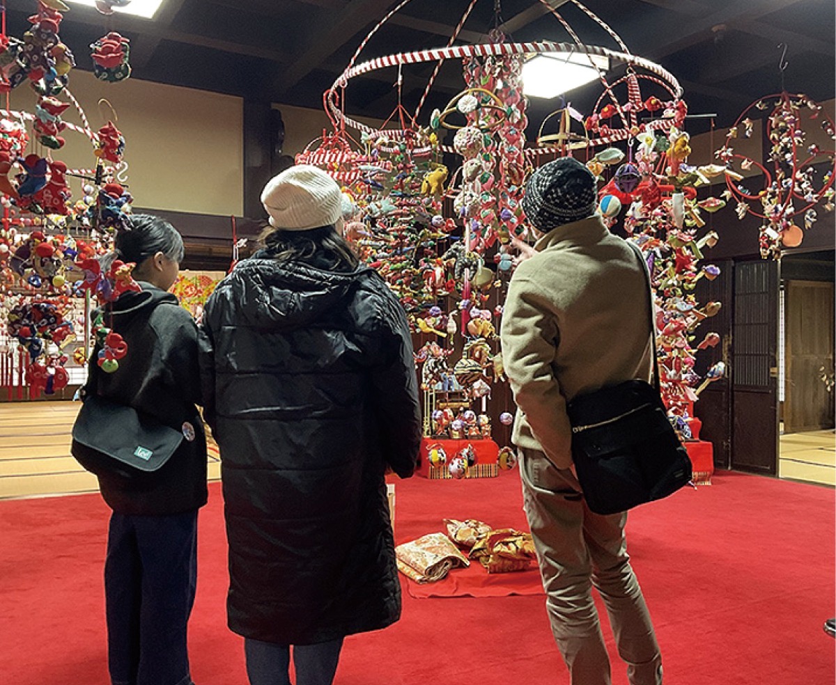 同展は2012年から開催される早春の人気イベント。地元の手芸サークルが制作した干支や毬、花、扇子などの愛らしい飾りが揺れるつるし雛をはじめ、サークル会員による手作りの手芸作品、町民から寄贈されたひな人形なども展示される。