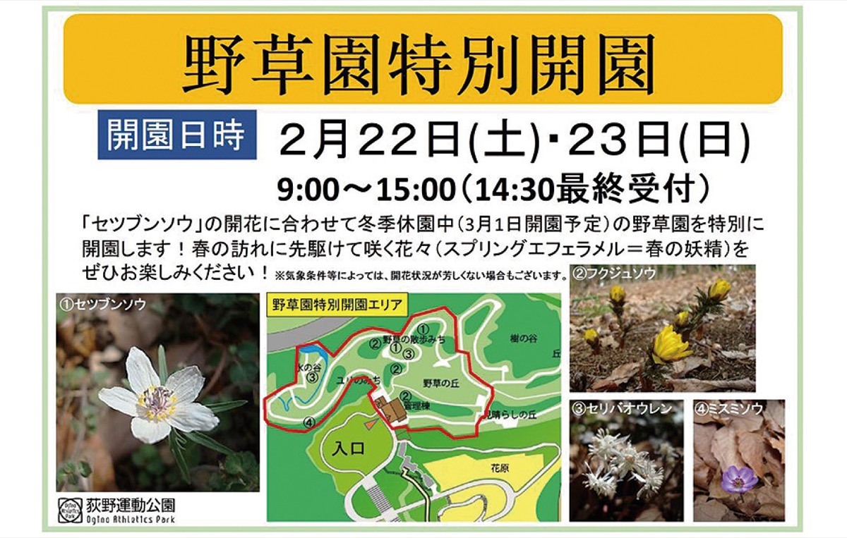 荻野運動公園の野草園(厚木市中荻野1500)で、セツブンソウの見頃に合わせて、2月22日(土)と23日(日)に特別開園が行われる。午前9時から午後3時(最終受付午後2時30分)。