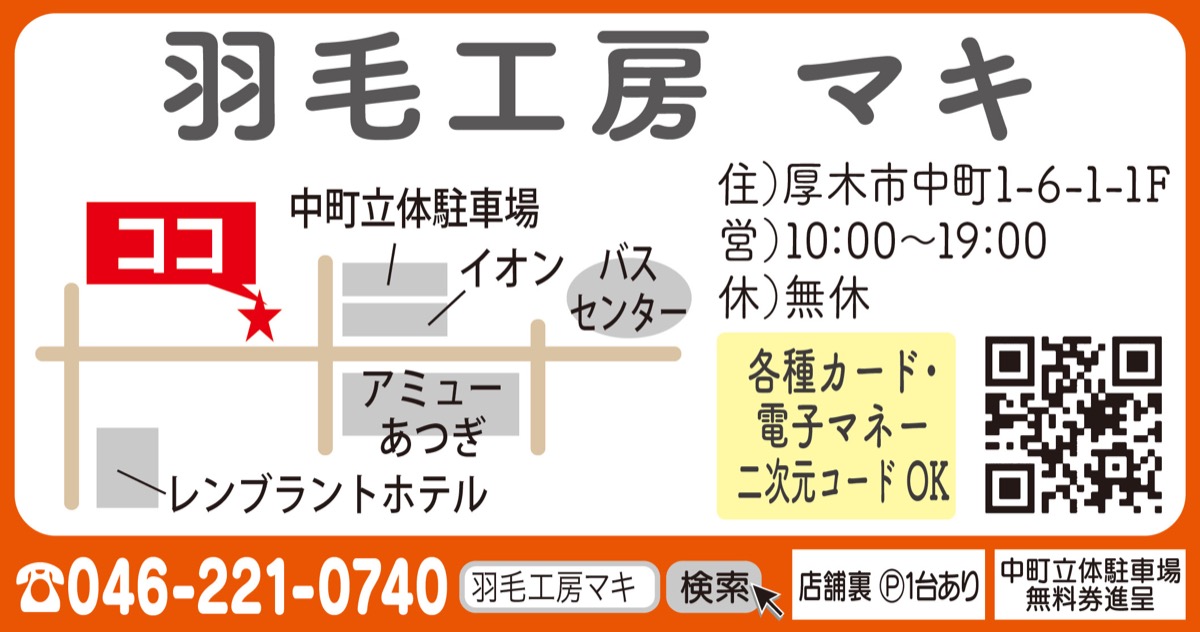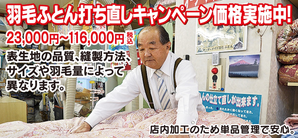 買替えや打ち直し(リフォーム)なら本厚木駅東口3分の創業75年・羽毛工房マキ。店内に羽毛ふとん製造機を常設し、プロの技で本物志向の羽毛ふとんに仕上げる。