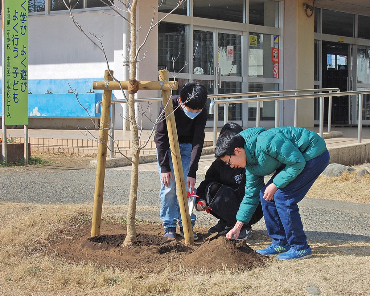 完成式典には、全校児童や教職員、保護者をはじめ、同募金の指定法人である(公財)かながわトラストみどり財団やローソン、町教育委員会、(有)井上造園土木の関係者らが出席。代表児童がハナミズキの根元に土を盛った=写真。