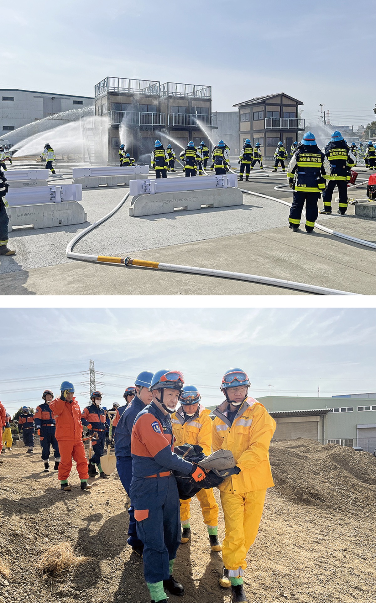 愛川町と座間市の消防団が2月16日、大規模災害時の対応能力強化に向けた合同訓練を厚木市下津古久の県消防学校災害救助訓練場で行った。