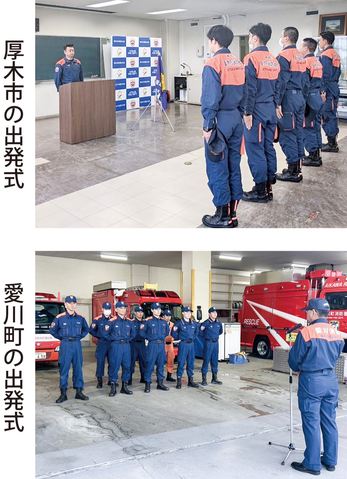 両市町の消防隊員は3月3日午後1時に厚木市下津古久の神奈川県消防学校に集まり、神奈川県大隊の「第3ブロック」に合流した。午後2時に消防学校を出発した隊員らは、深夜0時前に宿営地となる宮城県気仙沼市内の体育館に入った。