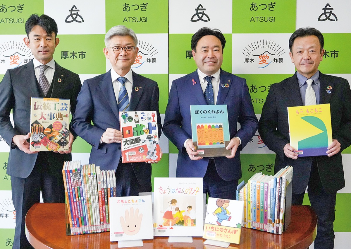 当日は同金庫の井萱誠常務理事、広瀬邦仁厚木南エリア支店長が市役所を訪れ、山口貴裕市長に児童書を手渡した。「地域貢献できることをうれしく思う。今後も将来を担う子どもたちのために続けていきたい」と井萱常務。山口市長は「長きにわたる寄付に感謝。読書離れと言われるなか、寄付は本への興味や読むきっかけにつながる。引き続き本に親しむ環境づくりに力添えいただきたい」と話した。