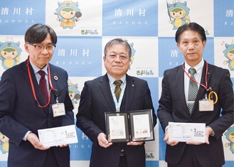 10日には、日本郵便株式会社厚木北郵便局の小林浩章局長と煤ヶ谷郵便局の山口久茂局長が今回の取り組みが「地域見守り活動への協力」につながるとし、岩澤吉美村長を訪問し挨拶をした。