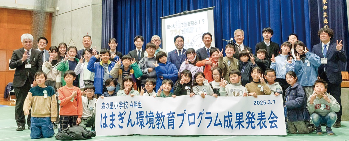 当日は、児童らがスライドを使いながら航空燃料の概要や地域での廃食用油回収の活動内容を発表。公民館やスーパーへのポスター掲示や住民への声かけ、地域の祭りでのブース出展などの取組も紹介し、「家で使った油が飛行機を飛ばす燃料になるのは知らなかった。初めて聞いたときはびっくりした」「いろいろな人から環境の話を聞けて勉強になった」と活動を振り返った。