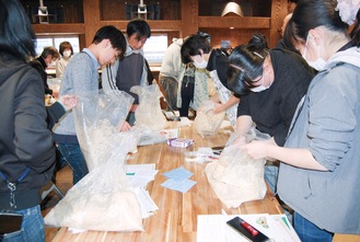 当日は、市内飯山で津久井在来大豆を栽培し、味噌作りを行っている臼井欽一さんが講師を務め、自身が栽培した大豆を使った味噌作りについて解説。参加者は、大豆を入れた袋を足や腕などで潰し、臼井さんが自家製造した麹に塩を混ぜ合わせるなど味噌づくりの工程を学んだ。