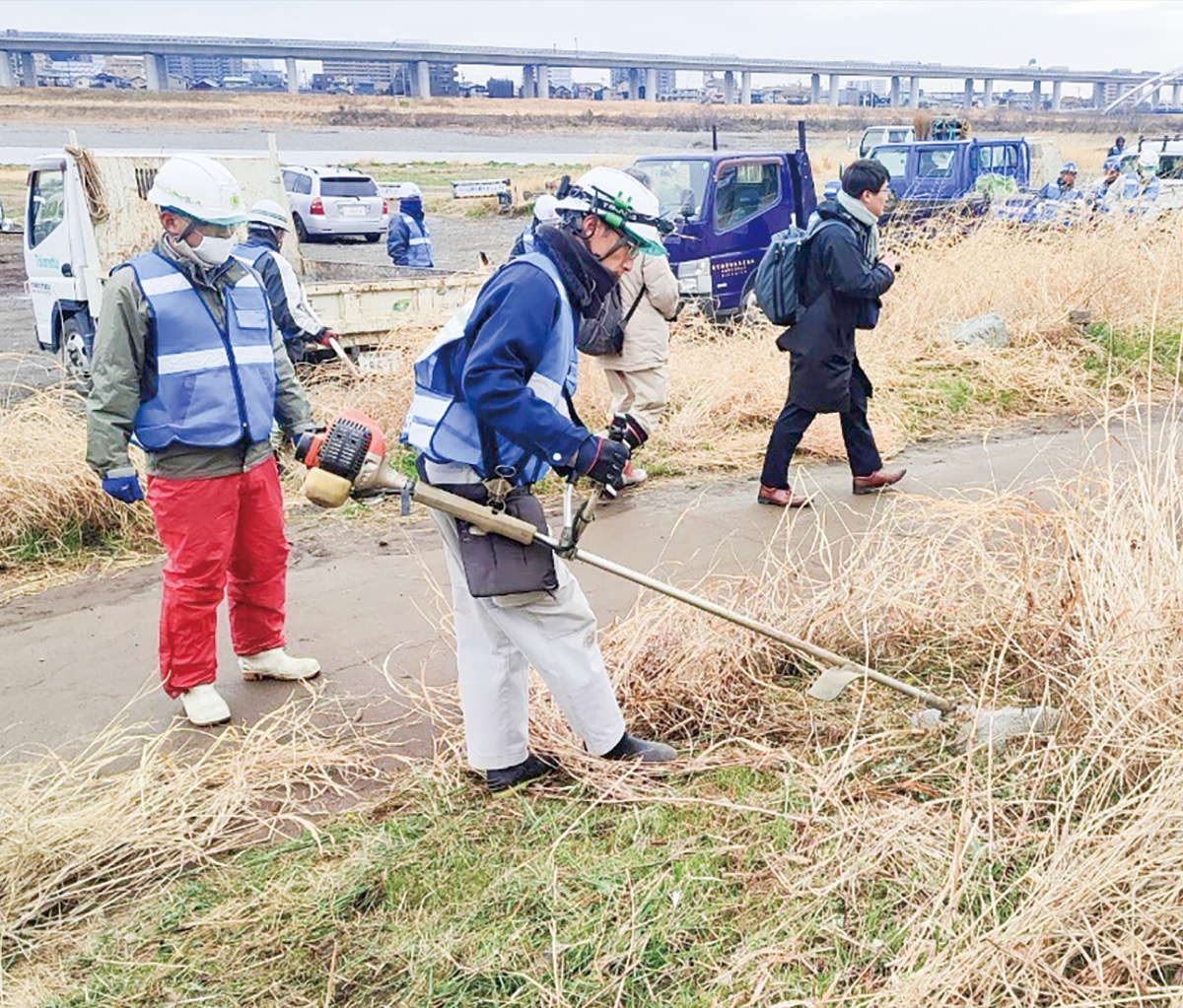 (一社)神奈川県建設業協会県央支部が3月4日、厚木市厚木町地内の相模川等三川合流点付近の河川堤防で草刈りボランティアを実施した。当日は会員ら約50人が参加し、地域住民と協力して作業を行った。