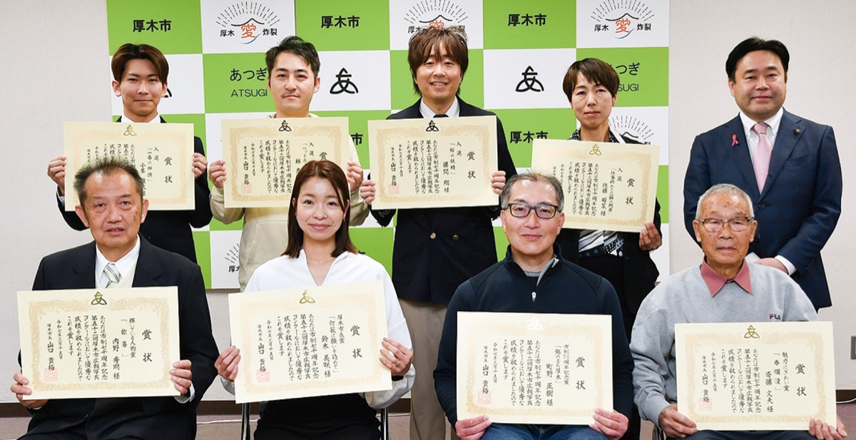 厚木市広報写真コンクールの表彰式が3月15日に市役所本庁舎で開かれ、市長賞などの受賞者8人に、山口貴裕市長から賞状と記念品が手渡された。