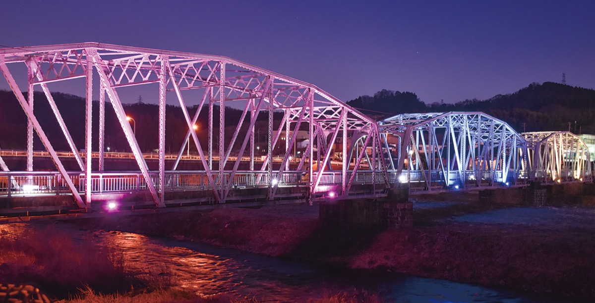 歴史的価値のある橋をライトアップし、地域の魅力をPRしようと田代区が主催で毎年開催している。欄干などに配したLEDが青やピンク、黄色に輝き、重厚な橋が色彩豊かに。点灯初日の22日には、周辺をジョギングする人などがスマートフォンで撮影する姿が見られた。