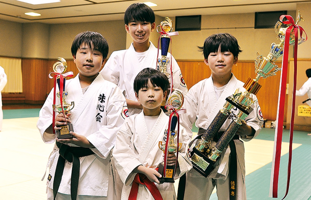 形の部▽高知虎太郎(男女幼年の部準優勝)、河野葉琉(男子小学5年の部準優勝)、齋藤優成(男子小学6年の部優勝)、藤井璃空(同部準優勝)