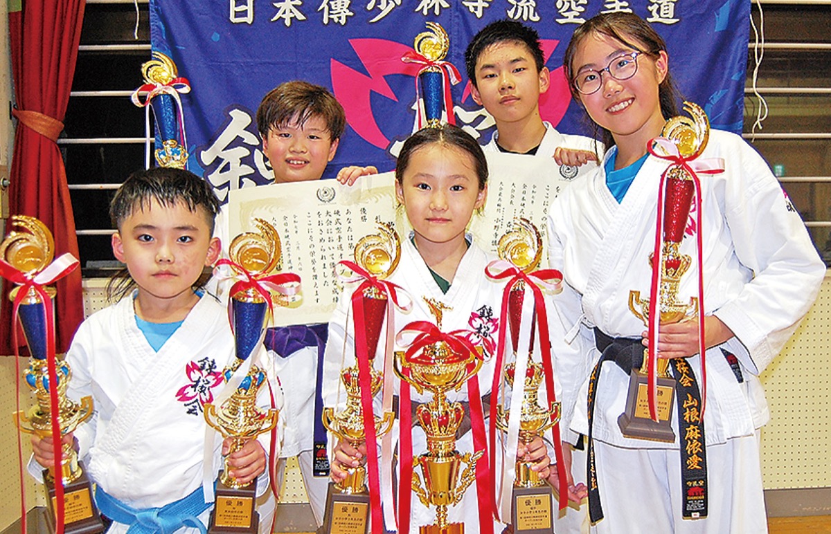 形の部▽山根大昊(男女幼年の部優勝)、山根由彩乃(女子小学3年の部優勝)、中里飛陽(男子小学4年の部優勝)、伊藤瑠星(男子中学1年の部優勝)