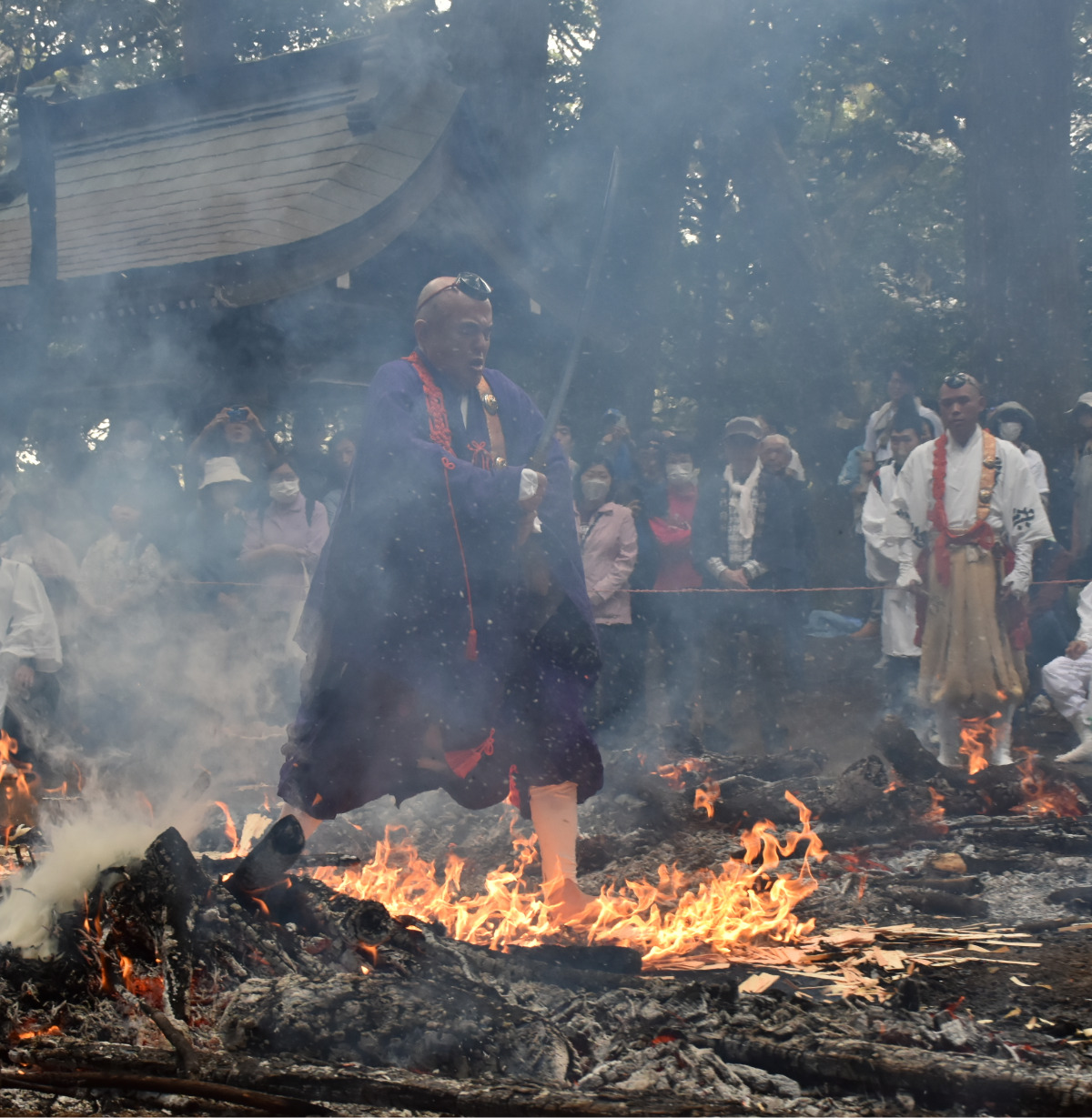 山伏装束をまとった修験者らがほら貝を吹きながら境内に姿を現すと、斧や弓、槍を使った儀式を行い護摩壇に火を放った。見物客は燃え盛る炎に向かって一斉に護摩木を投げ込み、炎で崩れ落ちた護摩壇の残骸の中を修験者が一気に渡り切ると、境内に大きな歓声が響いた。