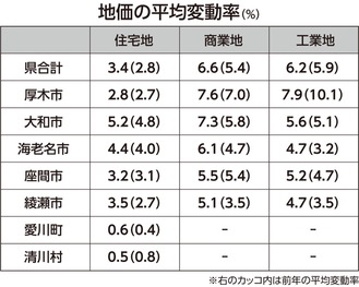 工業地は厚木市が7%以上で県平均よりも高い上昇率を示した。圏央道や新東名のインターチェンジを擁する厚木市、県内で4番目に大きい伸びとなったが、昨年の10・1%と比べて鈍化した。