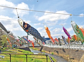 当日は朝9時頃から同会の会員30人が集まり、200mにわたり川をまたぐようにして鯉のぼりを設置。作業を見守る家族連れからは、大きな鯉のぼりが風にたなびくたびに歓声が上がった。