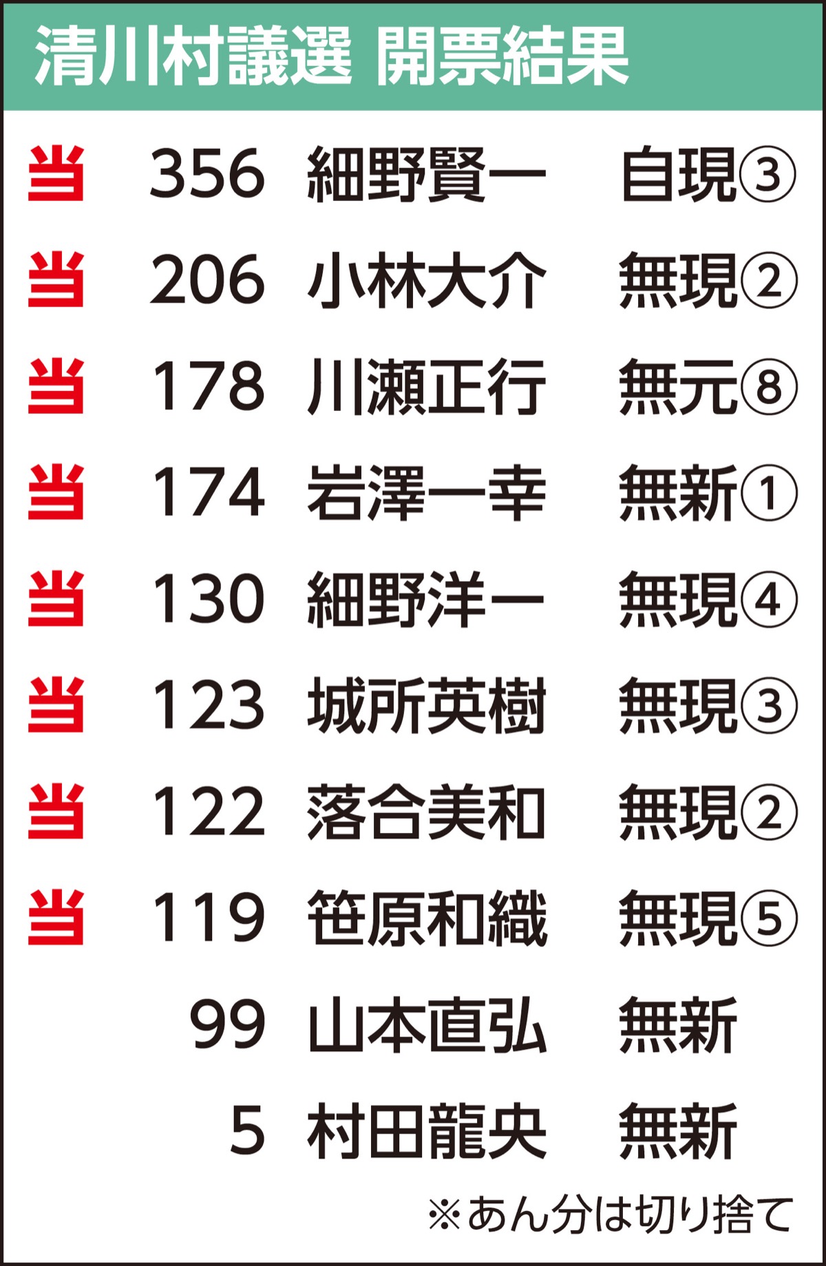 任期満了に伴う清川村議会議員選挙の投開票が4月20日に行われ、新たな8人の顔ぶれが決まった。最多得票は自民党の公認を受けた細野賢一氏(50)で、3期連続の当選。投票率は66・36%で、前回選挙の70・36%を4・0ポイント下回る過去最低だった。
